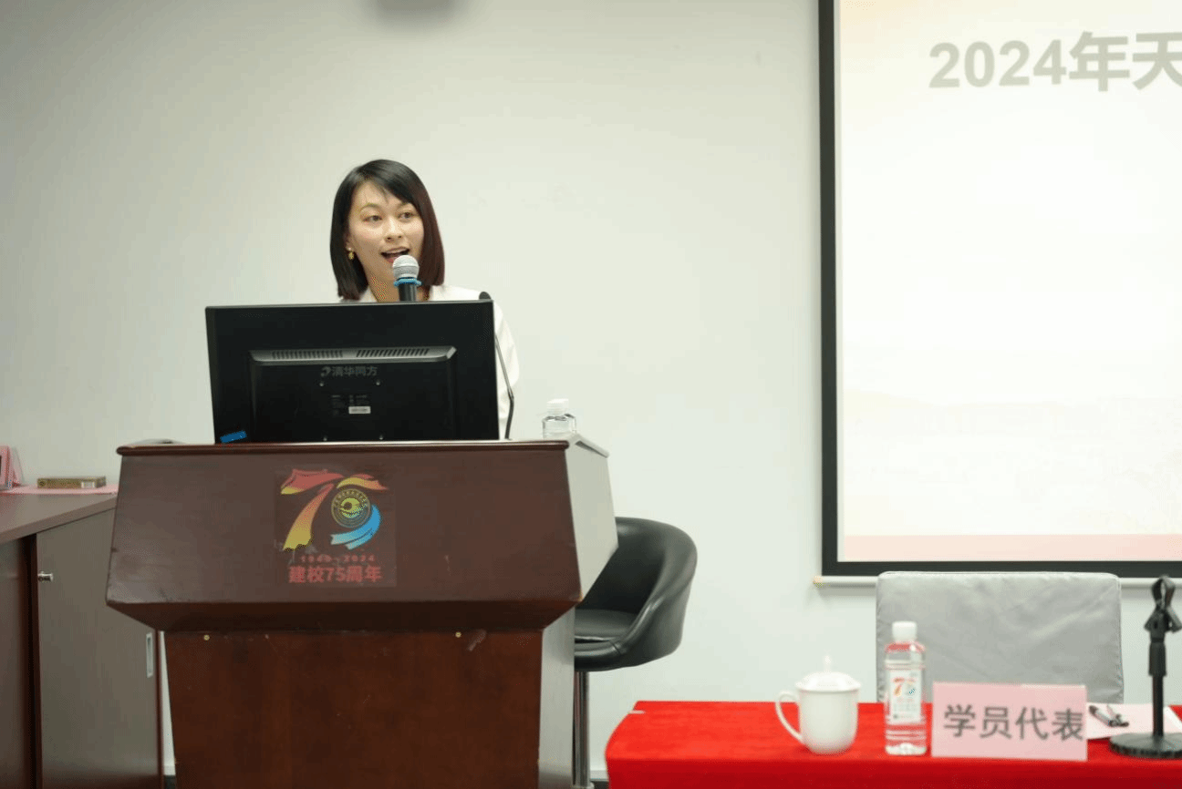 随后,广州市天河区第一实验小学副校长陈郁阳代表全体学员发言,表示在本次培训中将做到三个“心”(同音词:心、新、薪):全身“心”投入培训学习,将“以终为始”贯穿在学习全过程;以求是创“新”的躬耕态度,将习近平总书记弘扬教育家精神的要求落实到培训实践中;“薪”火相传,不负韶华。